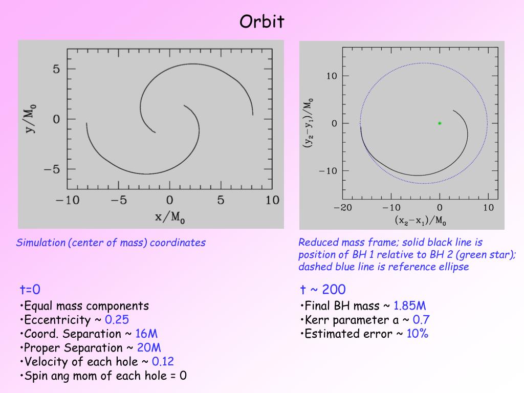Orbit Reduced mass frame; solid black line is position of BH 1 relative to BH 2 (green star); dashed blue line is reference ellipse Simulation (center of mass) coordinates • t=0 • Equal mass components • Eccentricity ~ 0.25 • Coord. Separation ~ 16M • Proper Separation ~ 20M • Velocity of each hole ~ 0.12 • Spin ang mom of each hole = 0 • t ~ 200 • Final BH mass ~ 1.85M • Kerr parameter a ~ 0.7 • Estimated error ~ 10%