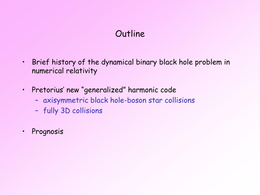 Outline • Brief history of the dynamical binary black hole problem in numerical relativity • Pretorius’ new “generalized” harmonic code • axisymmetric black hole-boson star collisions • fully 3D collisions • Prognosis