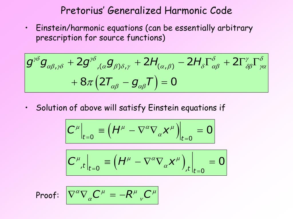 Pretorius’ Generalized Harmonic Code • Einstein/harmonic equations (can be essentially arbitrary prescription for source functions) • Solution of above will satisfy Einstein equations ifProof: