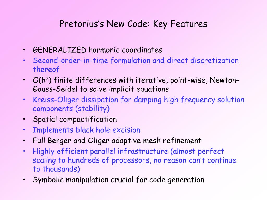 Pretorius’s New Code (in development for about 3 years) • Key features • “ad hoc”; ignored much “conventional wisdom” (often when CW had no empirical basis) • Arguably only fundamentals retained from 30 years of cumulative experience in numerical relativity: • Geometrodynamics is a useful concept (Dirac, Wheeler …) • Pay attention to constraints (Dewitt, … )