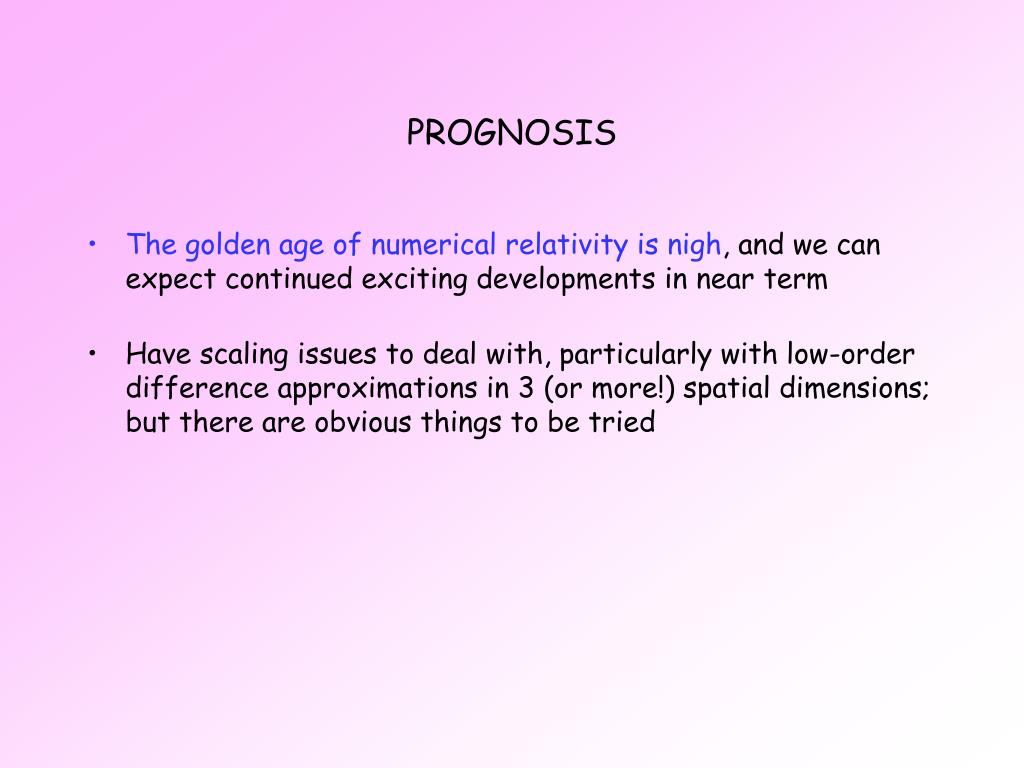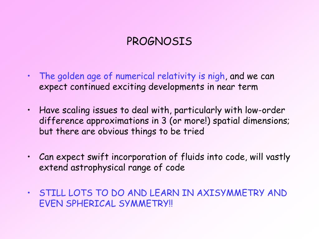 PROGNOSIS • The golden age of numerical relativity is nigh, and we can expect continued exciting developments in near term • Have scaling issues to deal with, particularly with low-order difference approximations in 3 (or more!) spatial dimensions; but there are obvious things to be tried