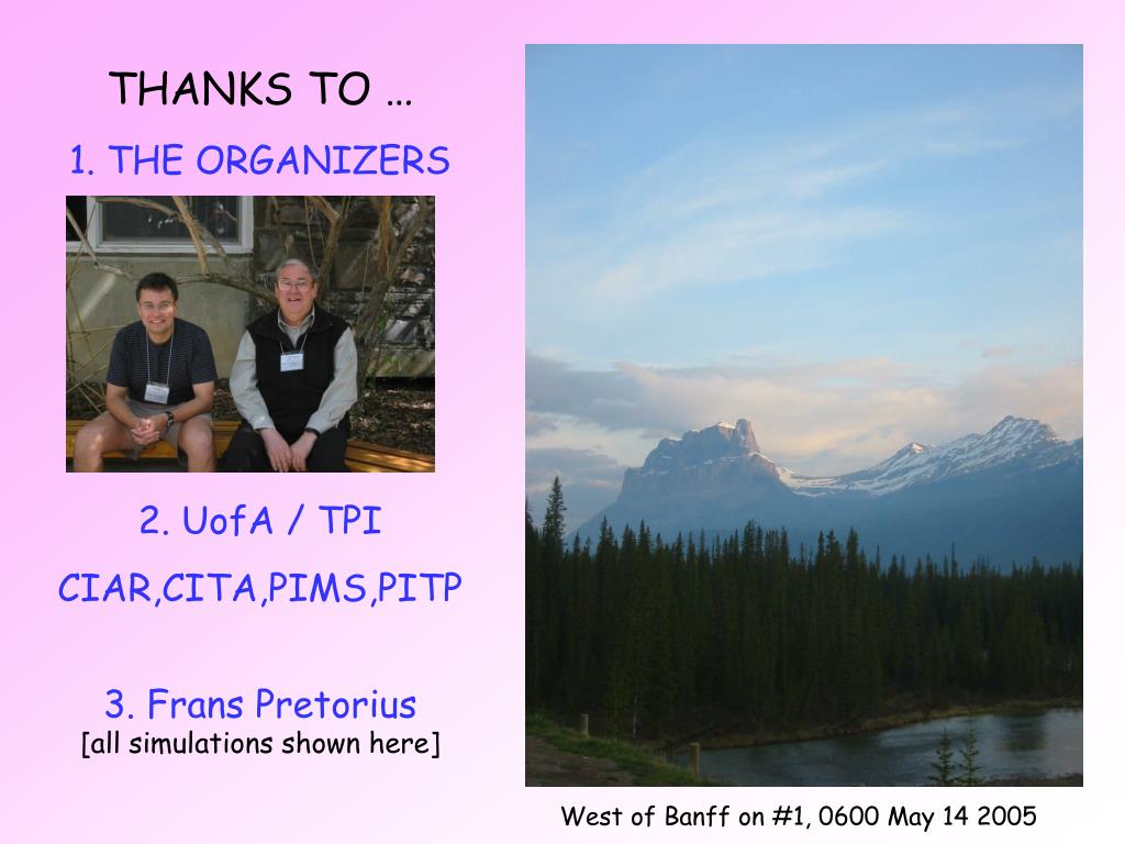 THANKS TO … 1. THE ORGANIZERS 2. UofA / TPI CIAR,CITA,PIMS,PITP 3. Frans Pretorius [all simulations shown here] West of Banff on #1, 0600 May 14 2005