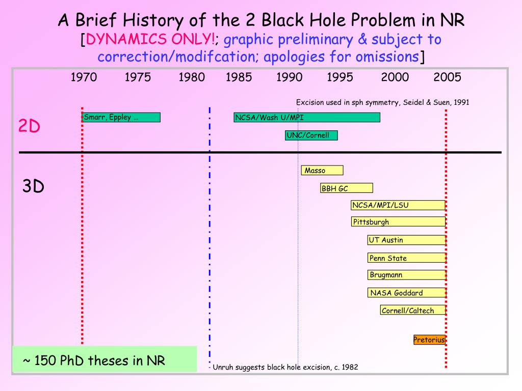 A Brief History of the 2 Black Hole Problem in NR[DYNAMICS ONLY!; graphic preliminary & subject to correction/modifcation; apologies for omissions] 1970 1975 1980 1985 1990 1995 2000 2005 Excision used in sph symmetry, Seidel & Suen, 1991 Smarr, Eppley … NCSA/Wash U/MPI 2D UNC/Cornell Masso 3D BBH GC NCSA/MPI/LSU Pittsburgh UT Austin Penn State Brugmann NASA Goddard Cornell/Caltech Pretorius ~ 150 PhD theses in NR Unruh suggests black hole excision, c. 1982