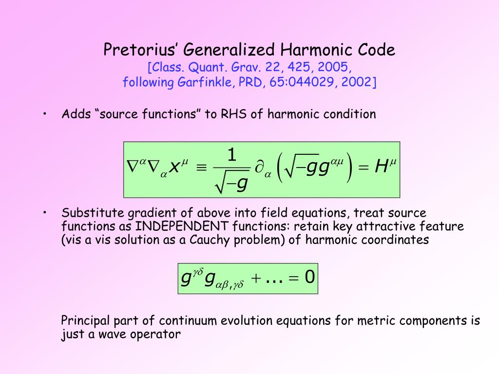 Pretorius’ Generalized Harmonic Code[Class. Quant. Grav. 22, 425, 2005, following Garfinkle, PRD, 65:044029, 2002] • Adds “source functions” to RHS of harmonic condition • Substitute gradient of above into field equations, treat source functions as INDEPENDENT functions: retain key attractive feature (vis a vis solution as a Cauchy problem) of harmonic coordinatesPrincipal part of continuum evolution equations for metric components is just a wave operator
