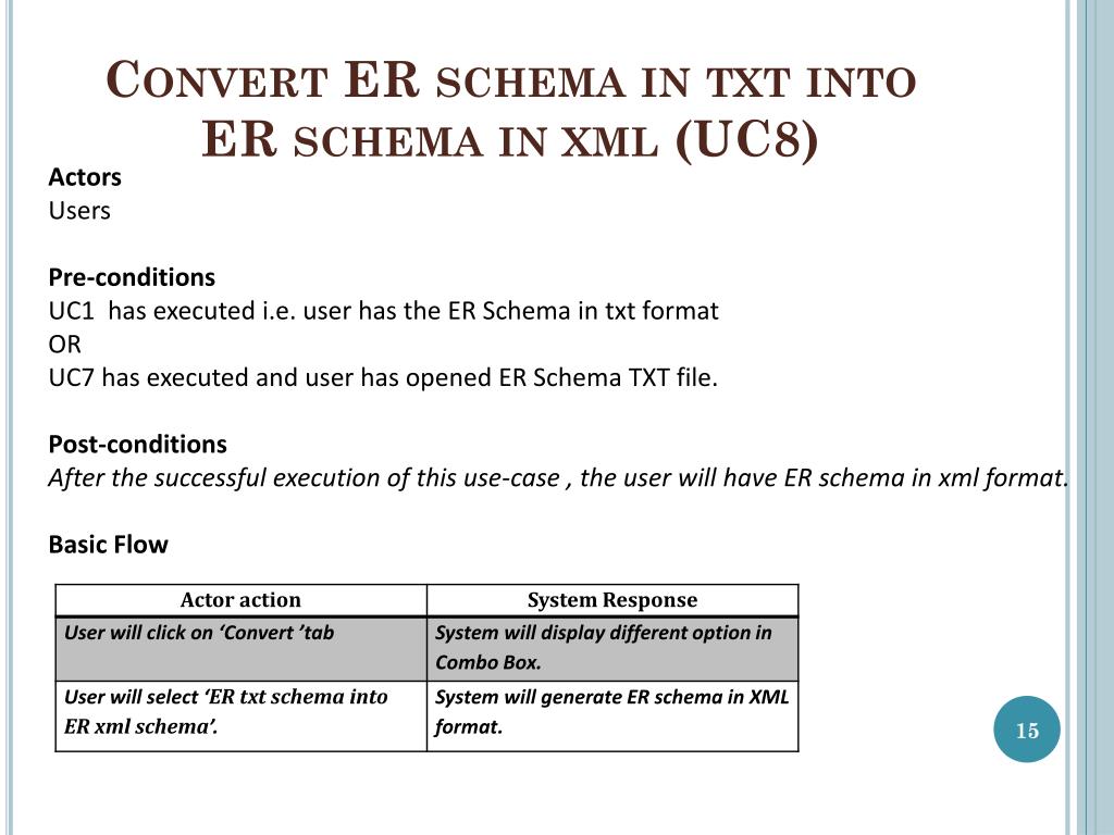Convert ER schema in txt into ER schema in xml (UC8) Actors • Users Pre-conditions UC1 has executed i.e. user has the ER Schema in txt format OR UC7 has executed and user has opened ER Schema TXT file. Post-conditions After the successful execution of this use-case , the user will have ER schema in xml format. Basic Flow