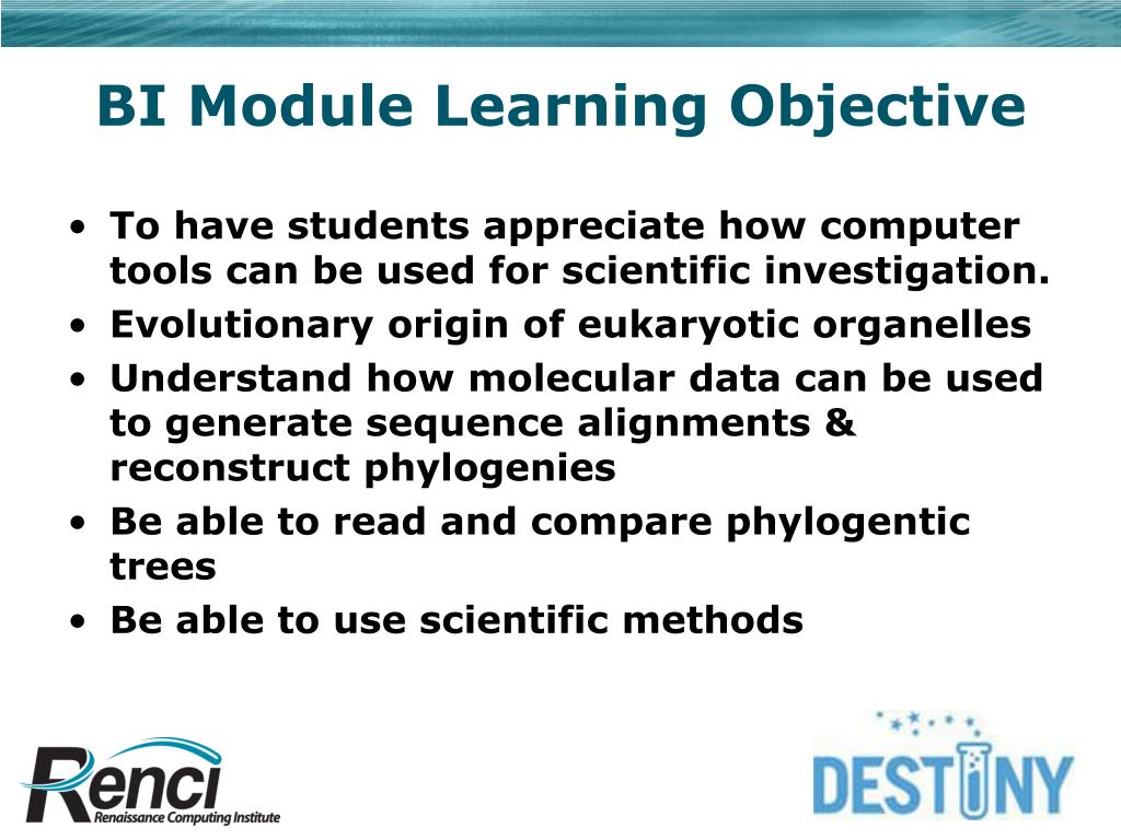 BI Module Learning Objective • To have students appreciate how computer tools can be used for scientific investigation. • Evolutionary origin of eukaryotic organelles • Understand how molecular data can be used to generate sequence alignments & reconstruct phylogenies • Be able to read and compare phylogentic trees • Be able to use scientific methods
