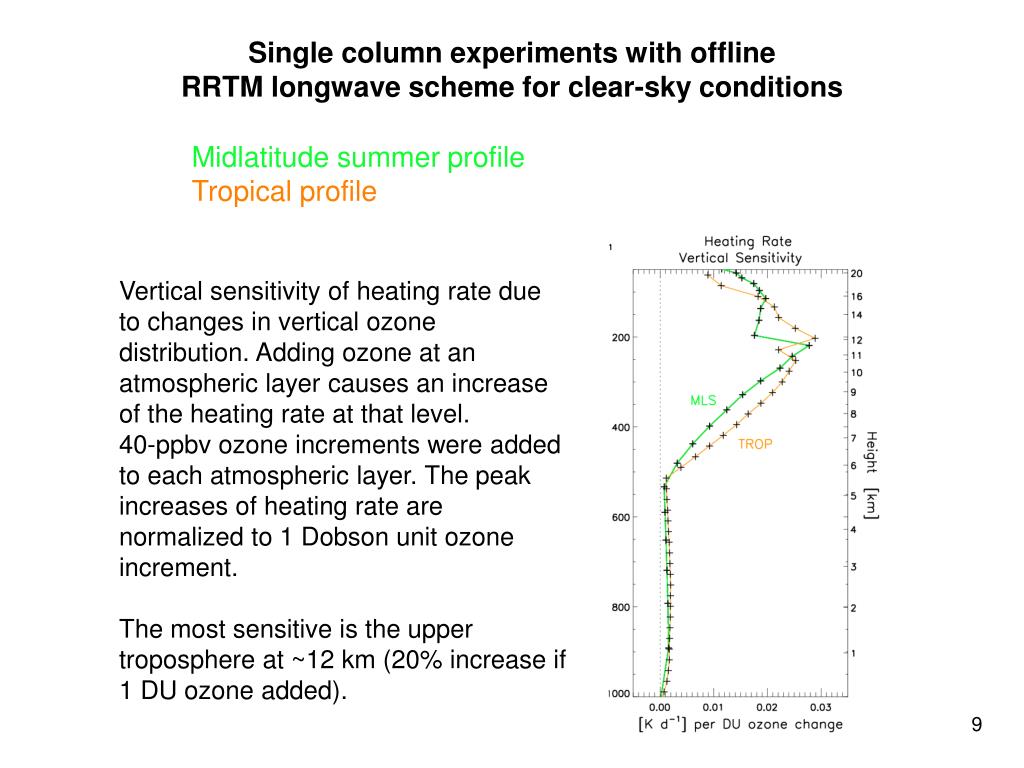 Single column experiments with offlineRRTM longwave scheme for clear-sky conditions Midlatitude summer profile Tropical profile Vertical sensitivity of heating rate due to changes in vertical ozone distribution. Adding ozone at an atmospheric layer causes an increase of the heating rate at that level. 40-ppbv ozone increments were added to each atmospheric layer. The peak increases of heating rate are normalized to 1 Dobson unit ozone increment. The most sensitive is the upper troposphere at ~12 km (20% increase if 1 DU ozone added).