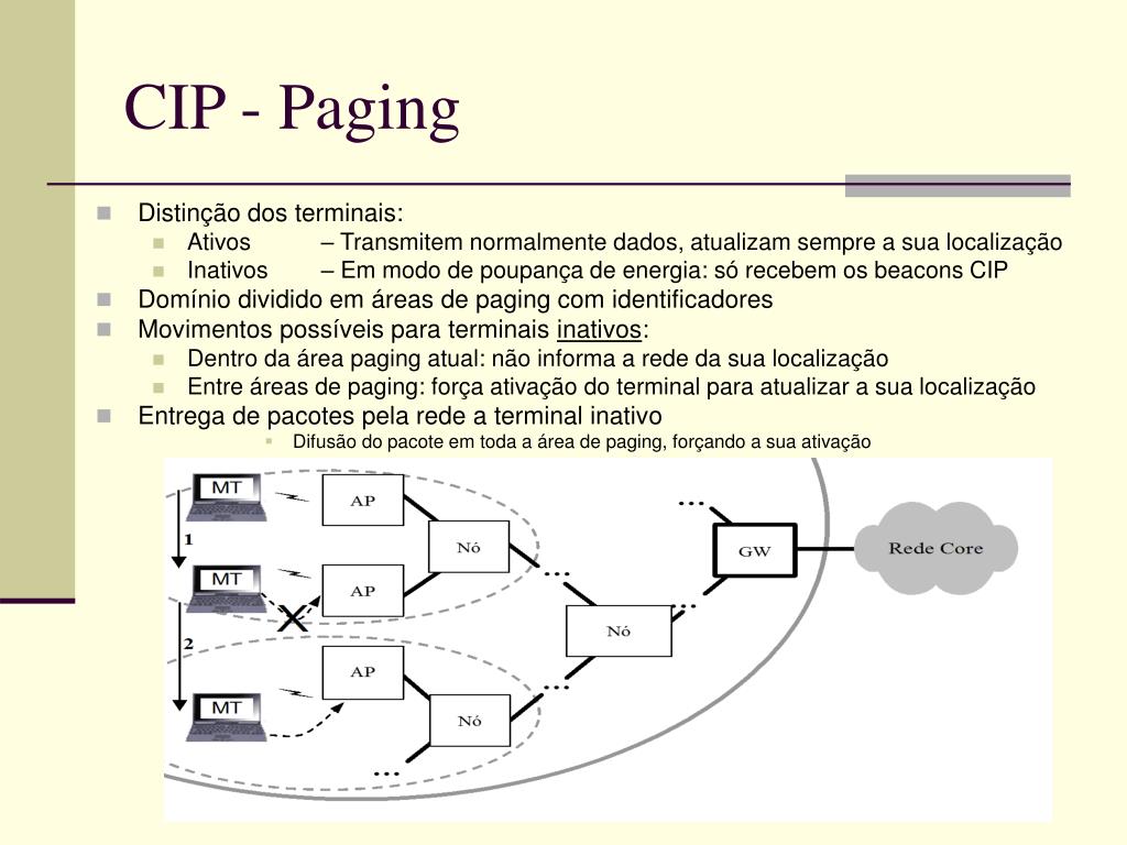 CIP - Paging • Distinção dos terminais: • Ativos – Transmitem normalmente dados, atualizam sempre a sua localização • Inativos – Em modo de poupança de energia: só recebem os beacons CIP • Domínio dividido em áreas de paging com identificadores • Movimentos possíveis para terminais inativos: • Dentro da área paging atual: não informa a rede da sua localização • Entre áreas de paging: força ativação do terminal para atualizar a sua localização • Entrega de pacotes pela rede a terminal inativo • Difusão do pacote em toda a área de paging, forçando a sua ativação