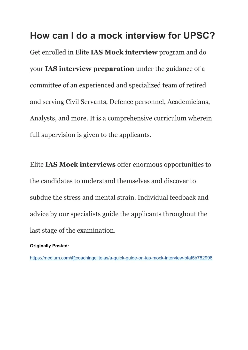 How can I do a mock interview for UPSC? Get enrolled in Elite IAS Mock interview program and do your IAS interview preparation under the guidance of a committee of an experienced and specialized team of retired and serving Civil Servants, Defence personnel, Academicians, Analysts, and more. It is a comprehensive curriculum wherein full supervision is given to the applicants. Elite IAS Mock interviews offer enormous opportunities to the candidates to understand themselves and discover to subdue the stress and mental strain. Individual feedback and advice by our specialists guide the applicants throughout the last stage of the examination. Originally Posted: https://medium.com/@coachingeliteias/a-quick-guide-on-ias-mock-interview-bfaf5b782998