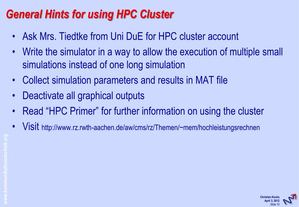 General Hintsforusing HPC Cluster • Ask Mrs. Tiedtke from UniDuE for HPC cluster account • Write the simulator in a way to allow the execution of multiple small simulations instead of one long simulation • Collect simulation parameters and results in MAT file • Deactivate all graphical outputs • Read “HPC Primer” for further information on using the cluster • Visit http://www.rz.rwth-aachen.de/aw/cms/rz/Themen/~mem/hochleistungsrechnen