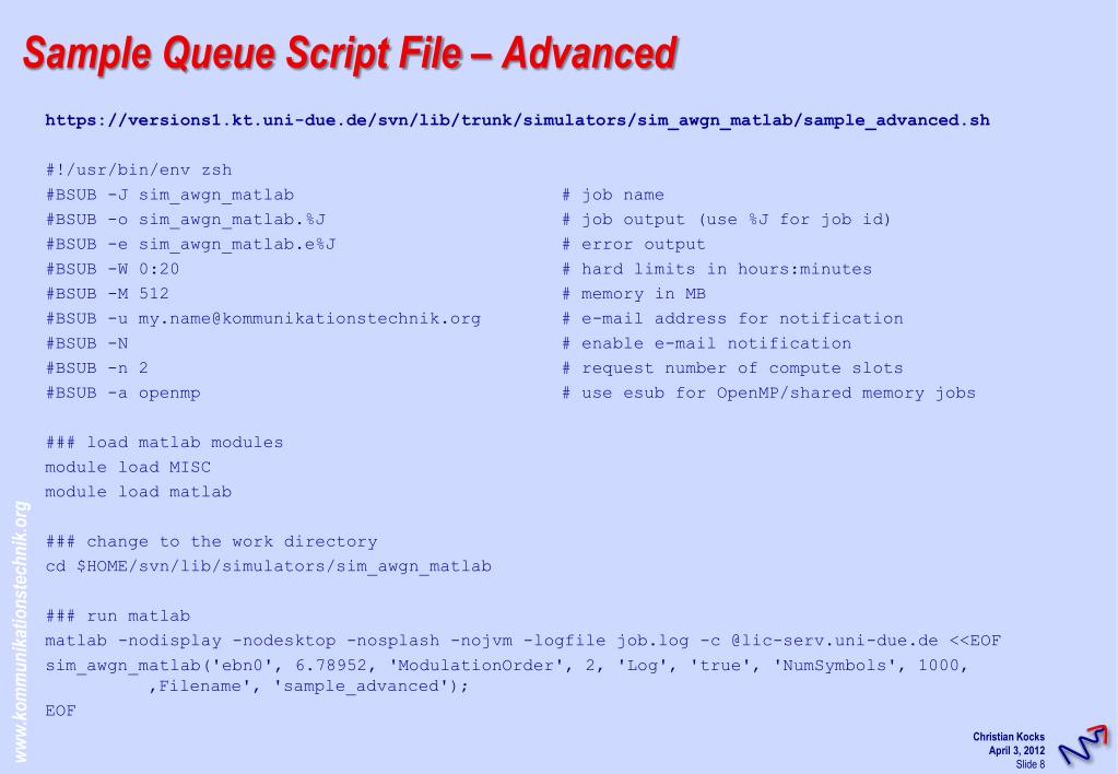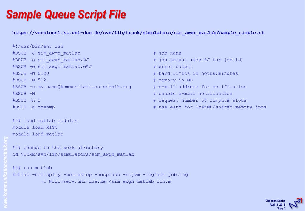 Sample Queue Script File https://versions1.kt.uni-due.de/svn/lib/trunk/simulators/sim_awgn_matlab/sample_simple.sh #!/usr/bin/envzsh #BSUB -J sim_awgn_matlab # jobname #BSUB -o sim_awgn_matlab.%J # joboutput (use %J forjobid) #BSUB -e sim_awgn_matlab.e%J # erroroutput #BSUB -W 0:20 # hardlimits in hours:minutes #BSUB -M 512 # memory in MB #BSUB -u my.name@kommunikationstechnik.org # e-mailaddressfornotification #BSUB -N # enablee-mailnotification #BSUB -n 2 # requestnumberofcomputeslots #BSUB -a openmp # useesubforOpenMP/sharedmemoryjobs ### loadmatlabmodules moduleload MISC moduleloadmatlab ### changetotheworkdirectory cd $HOME/svn/lib/simulators/sim_awgn_matlab ### runmatlab matlab-nodisplay -nodesktop -nosplash -nojvm -logfilejob.log -c @lic-serv.uni-due.de <sim_awgn_matlab_run.m