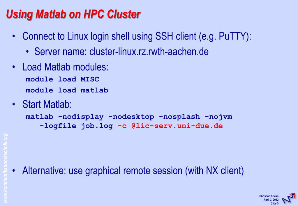 UsingMatlab on HPC Cluster • Connect to Linux login shell using SSH client (e.g. PuTTY): • Server name: cluster-linux.rz.rwth-aachen.de • Load Matlab modules: module load MISC module load matlab • Start Matlab: matlab -nodisplay -nodesktop -nosplash -nojvm -logfile job.log -c @lic-serv.uni-due.de • Alternative: use graphical remote session (with NX client)