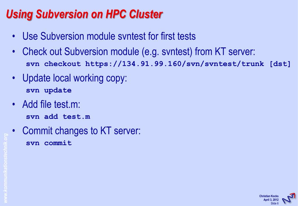 Using Subversion on HPC Cluster • Use Subversion module svntest for first tests • Check out Subversion module (e.g. svntest) from KT server: svn checkout https://134.91.99.160/svn/svntest/trunk [dst] • Update local working copy: svn update • Add file test.m: svn add test.m • Commit changes to KT server: svn commit