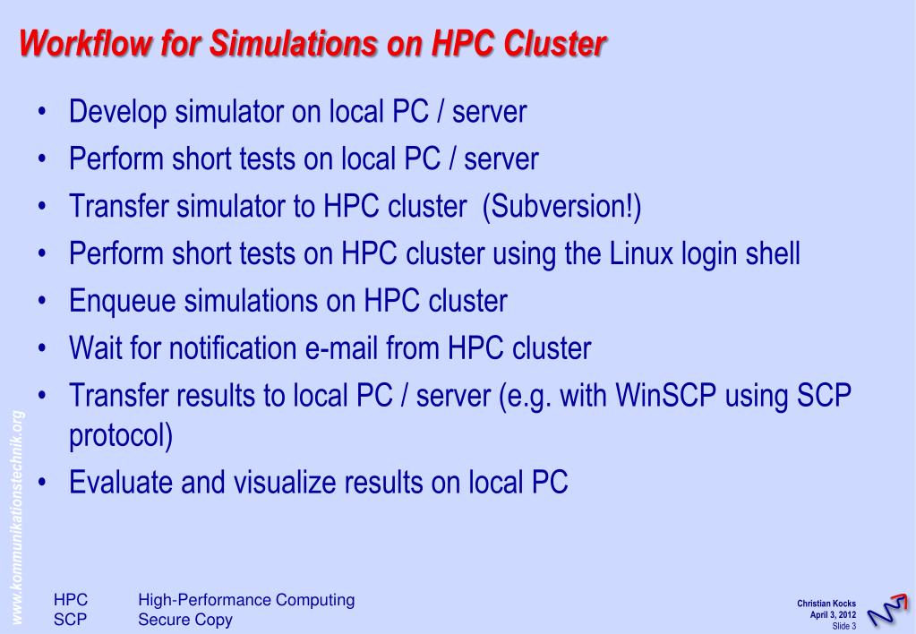 High-Performance Computing Cluster in Aachen. Christian Kocks April 3, 2012. Typical Simulation Workflow. Workflow for Simulations on HPC Cluster. Develop simulator on local PC / server Perform short tests on local PC / server Transfer simulator to HPC cluster (Subversion!)