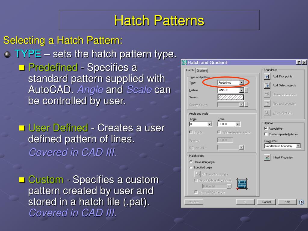 Hatch Patterns Selecting a Hatch Pattern: • TYPE – sets the hatch pattern type. • Predefined - Specifies a standard pattern supplied with AutoCAD. Angle and Scale can be controlled by user. • User Defined - Creates a user defined pattern of lines. Covered in CAD III. • Custom - Specifies a custom pattern created by user and stored in a hatch file (.pat). Covered in CAD III.