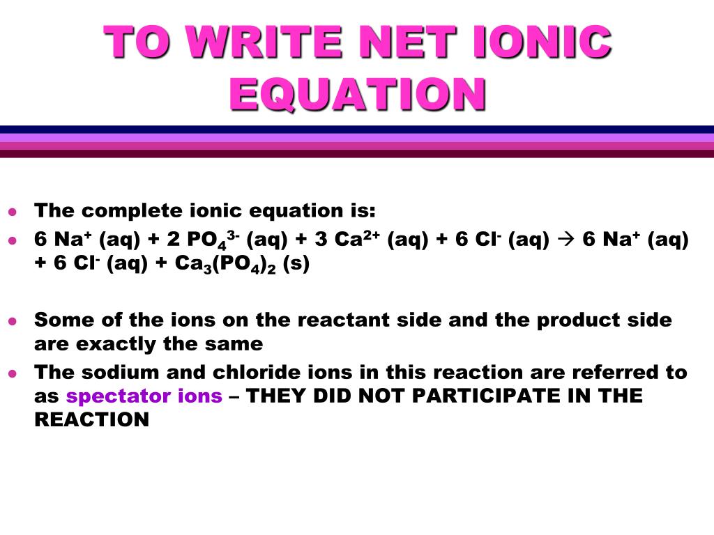TO WRITE NET IONIC EQUATION • Cross out the spectator ions that are present. • Write the "leftovers" as the net ionic equation. 6 Na+ (aq) + 2 PO43- (aq) + 3 Ca2+ (aq) + 6 Cl- (aq)6 Na+ (aq) + 6 Cl- (aq) + Ca3(PO4)2 (s) Net Ionic Equation: 2 PO43- (aq) + 3 Ca2+ (aq) Ca3(PO4)2 (s)