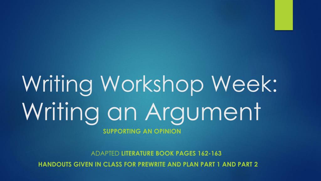 Writing Workshop Week: Writing an Argument. Supporting an Opinion Adapted Literature Book pages 162-163 handouts given in class for Prewrite and Plan Part 1 and Part 2 . The Plan: .