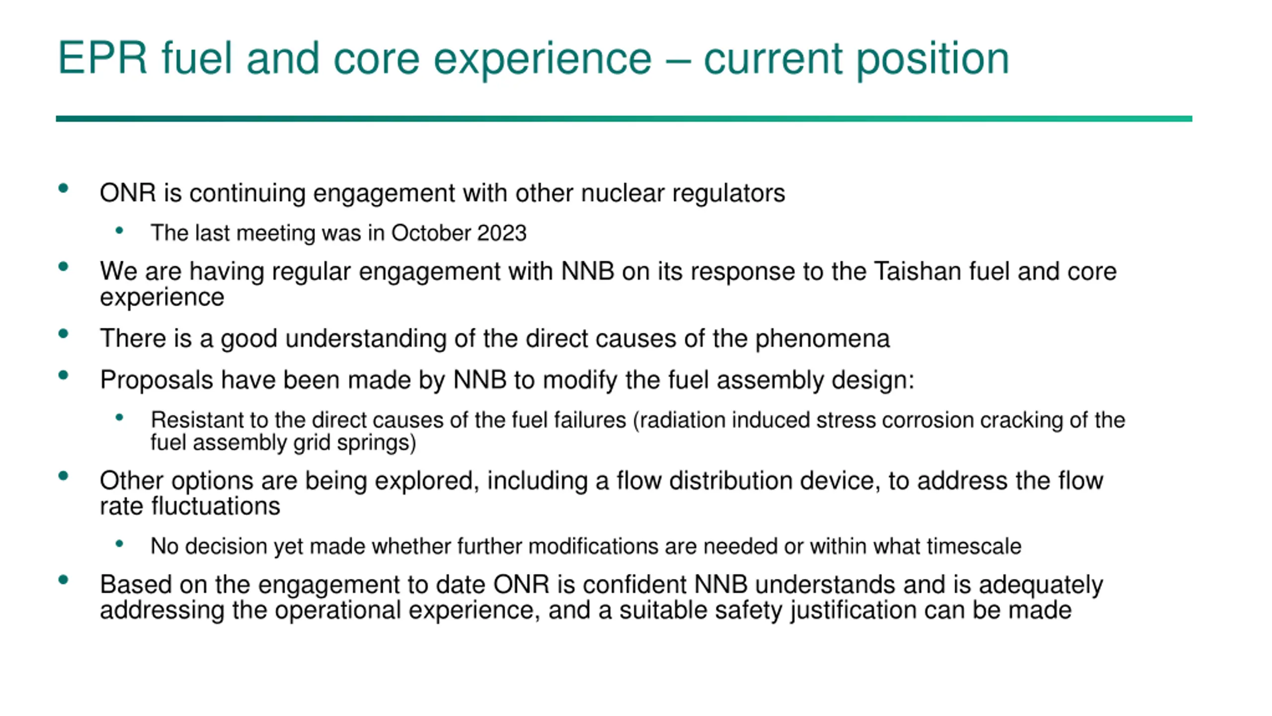 EPR fuel and core experience – current position • ONR is continuing engagement with other nuclear regulators • The last meeting was in October 2023 We are having regular engagement with NNB on its response to the Taishan fuel and core experience There is a good understanding of the direct causes of the phenomena Proposals have been made by NNB to modify the fuel assembly design: • Resistant to the direct causes of the fuel failures (radiation induced stress corrosion cracking of the fuel assembly grid springs) Other options are being explored, including a flow distribution device, to address the flow rate fluctuations • No decision yet made whether further modifications are needed or within what timescale Based on the engagement to date ONR is confident NNB understands and is adequately addressing the operational experience, and a suitable safety justification can be made • • • • •