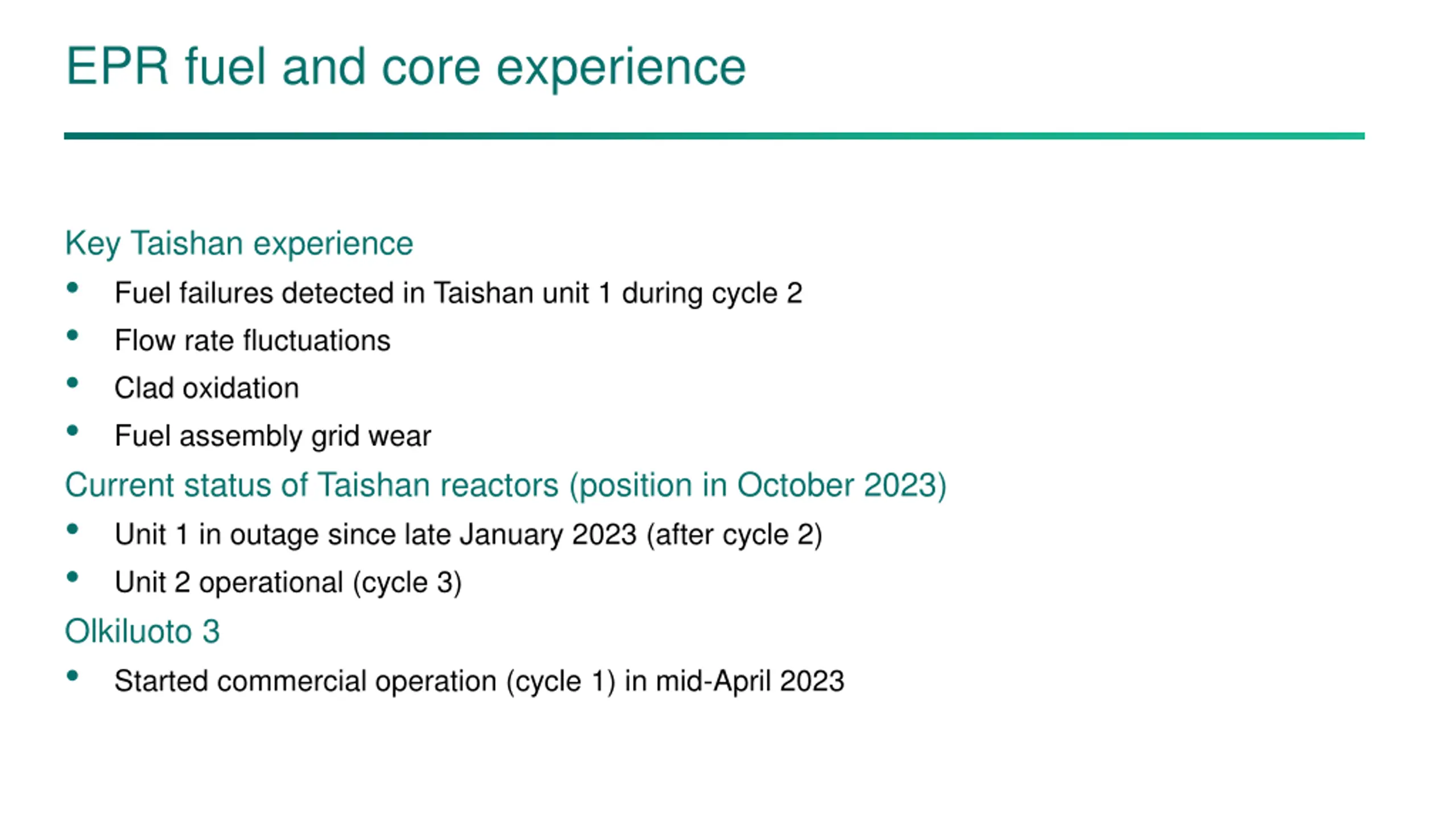 EPR fuel and core experience Key Taishan experience • Fuel failures detected in Taishan unit 1 during cycle 2 • Flow rate fluctuations • Clad oxidation • Fuel assembly grid wear Current status of Taishan reactors (position in October 2023) • Unit 1 in outage since late January 2023 (after cycle 2) • Unit 2 operational (cycle 3) Olkiluoto 3 • Started commercial operation (cycle 1) in mid-April 2023