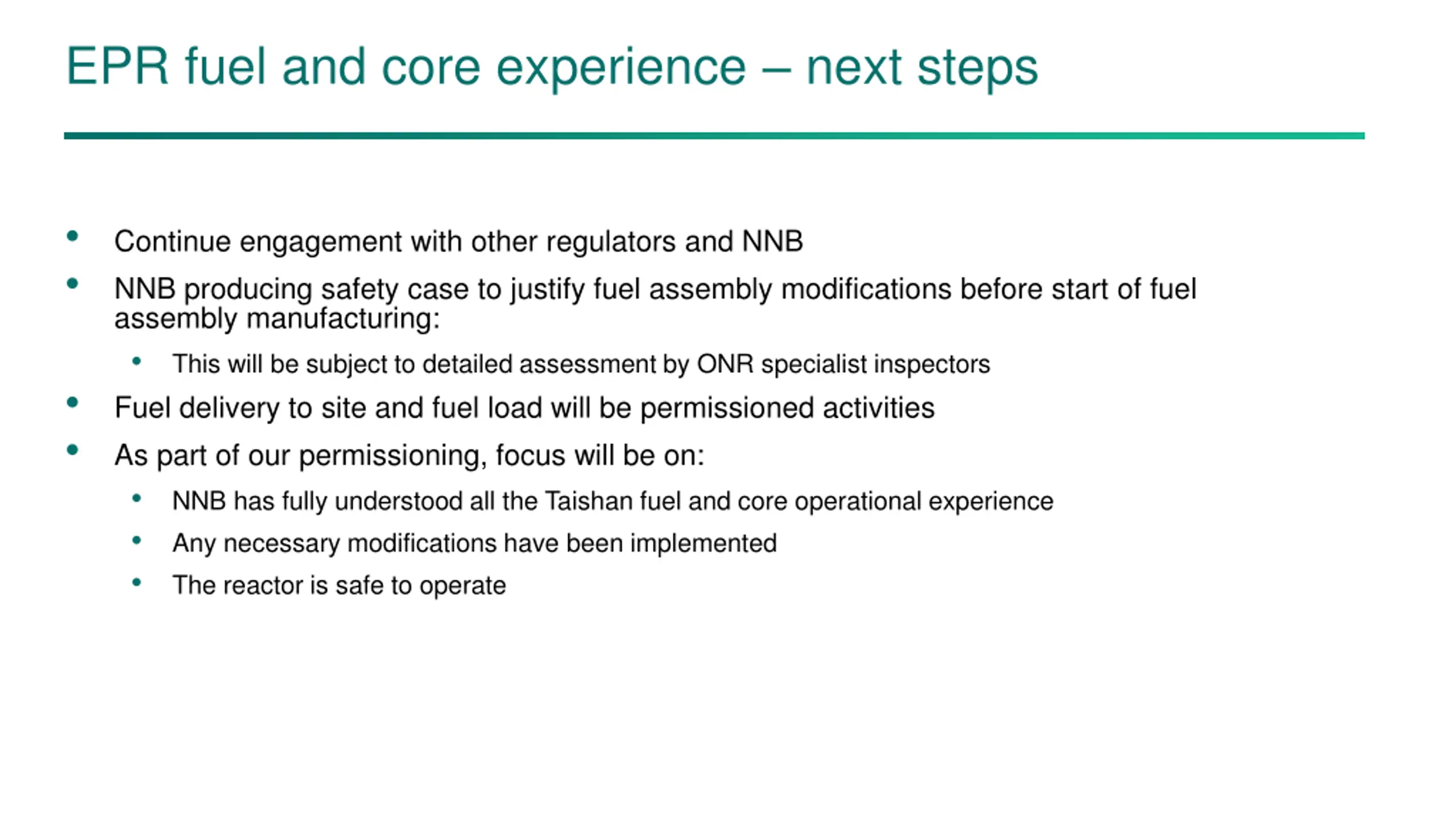 EPR fuel and core experience – next steps • • Continue engagement with other regulators and NNB NNB producing safety case to justify fuel assembly modifications before start of fuel assembly manufacturing: • This will be subject to detailed assessment by ONR specialist inspectors Fuel delivery to site and fuel load will be permissioned activities As part of our permissioning, focus will be on: • NNB has fully understood all the Taishan fuel and core operational experience • Any necessary modifications have been implemented • The reactor is safe to operate • •