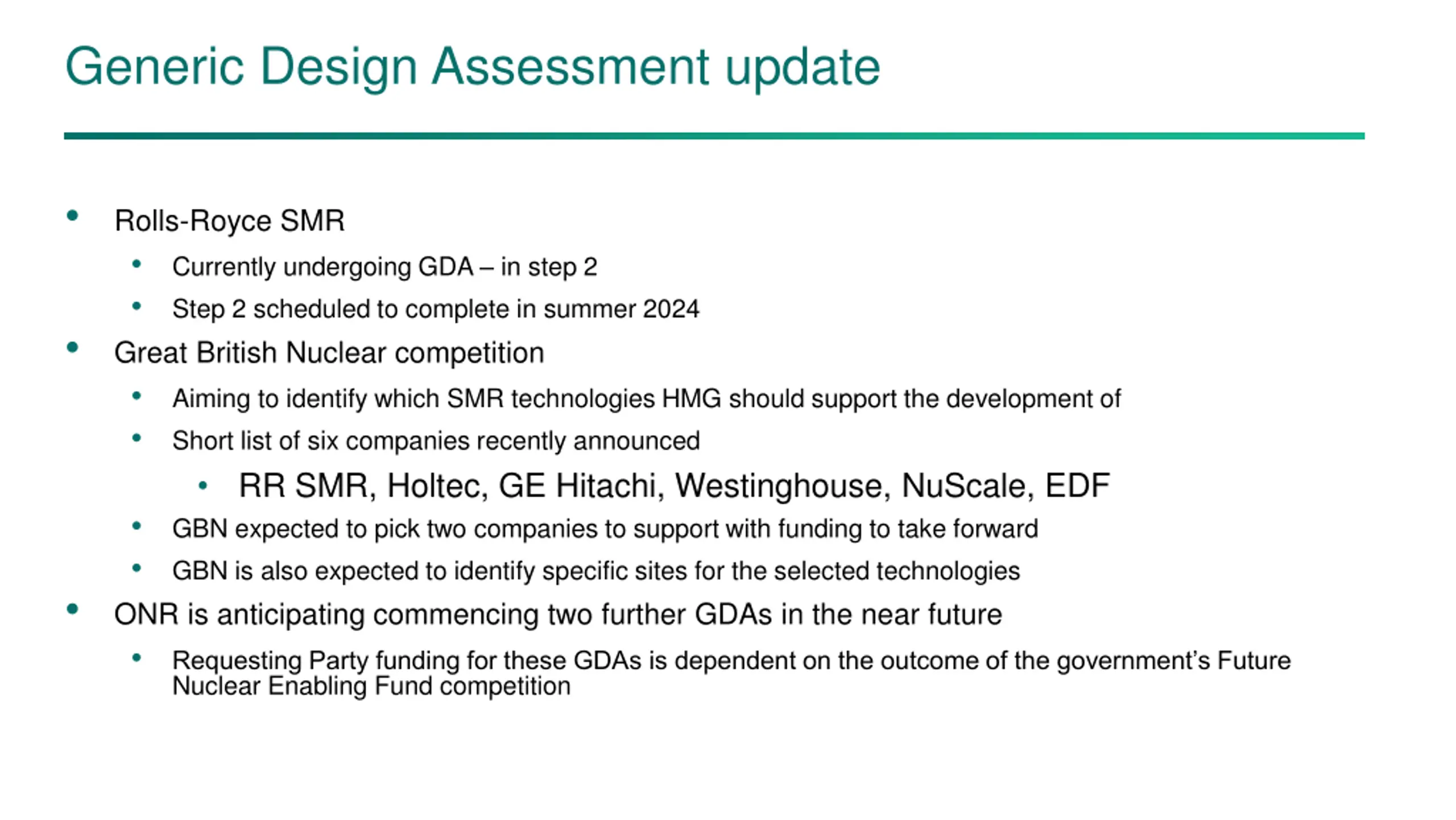 Generic Design Assessment update • Rolls-Royce SMR • Currently undergoing GDA – in step 2 • Step 2 scheduled to complete in summer 2024 Great British Nuclear competition • Aiming to identify which SMR technologies HMG should support the development of • Short list of six companies recently announced • RR SMR, Holtec, GE Hitachi, Westinghouse, NuScale, EDF • GBN expected to pick two companies to support with funding to take forward • GBN is also expected to identify specific sites for the selected technologies ONR is anticipating commencing two further GDAs in the near future • Requesting Party funding for these GDAs is dependent on the outcome of the government’s Future Nuclear Enabling Fund competition • •