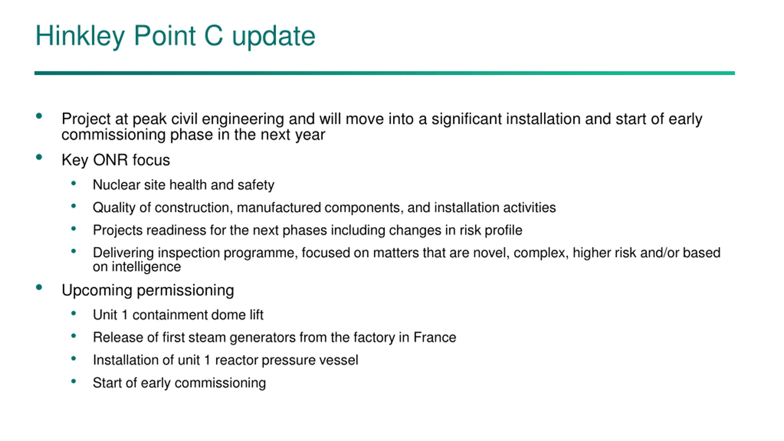 Hinkley Point C update • Project at peak civil engineering and will move into a significant installation and start of early commissioning phase in the next year Key ONR focus • Nuclear site health and safety • Quality of construction, manufactured components, and installation activities • Projects readiness for the next phases including changes in risk profile • Delivering inspection programme, focused on matters that are novel, complex, higher risk and/or based on intelligence Upcoming permissioning • Unit 1 containment dome lift • Release of first steam generators from the factory in France • Installation of unit 1 reactor pressure vessel • Start of early commissioning • •