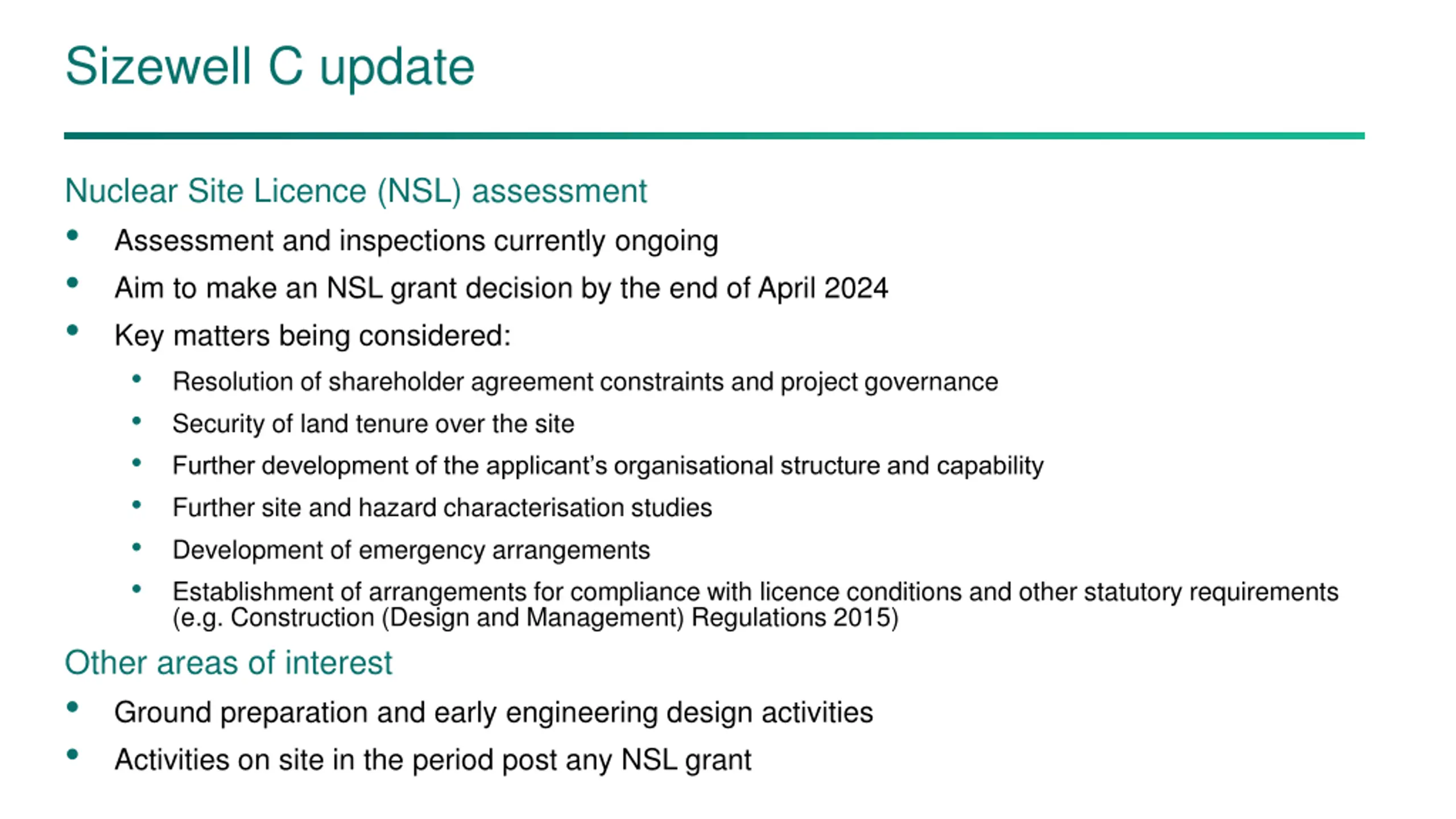 Sizewell C update Nuclear Site Licence (NSL) assessment • Assessment and inspections currently ongoing • Aim to make an NSL grant decision by the end of April 2024 • Key matters being considered: • Resolution of shareholder agreement constraints and project governance • Security of land tenure over the site • Further development of the applicant’s organisational structure and capability • Further site and hazard characterisation studies • Development of emergency arrangements • Establishment of arrangements for compliance with licence conditions and other statutory requirements (e.g. Construction (Design and Management) Regulations 2015) Other areas of interest • Ground preparation and early engineering design activities • Activities on site in the period post any NSL grant