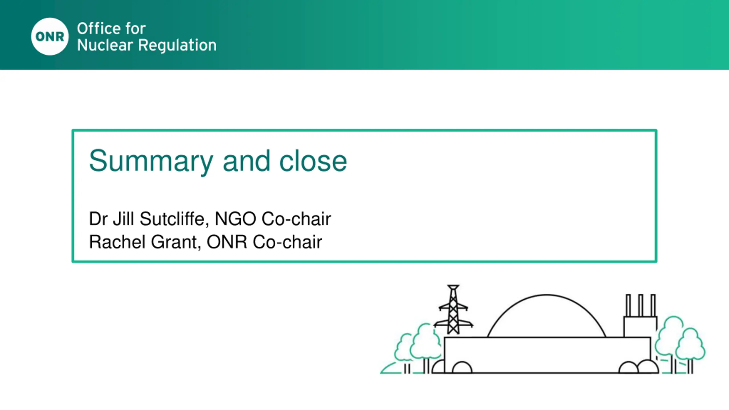 Summary and close Dr Jill Sutcliffe, NGO Co-chair Rachel Grant, ONR Co-chair