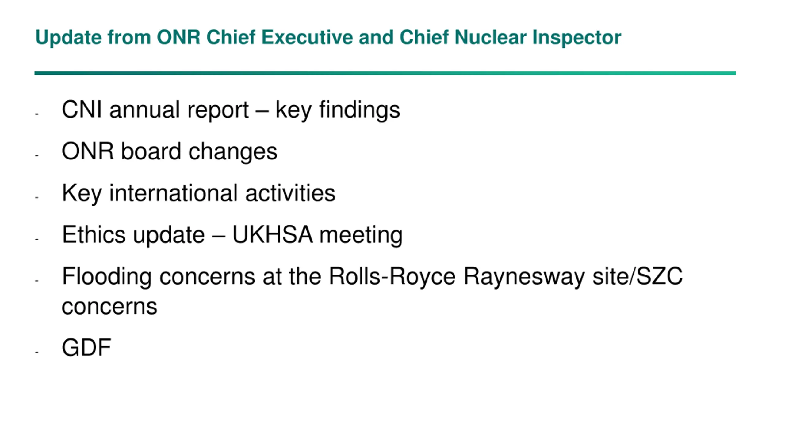 Update from ONR Chief Executive and Chief Nuclear Inspector CNI annual report – key findings - ONR board changes - Key international activities - Ethics update – UKHSA meeting - Flooding concerns at the Rolls-Royce Raynesway site/SZC concerns - GDF -