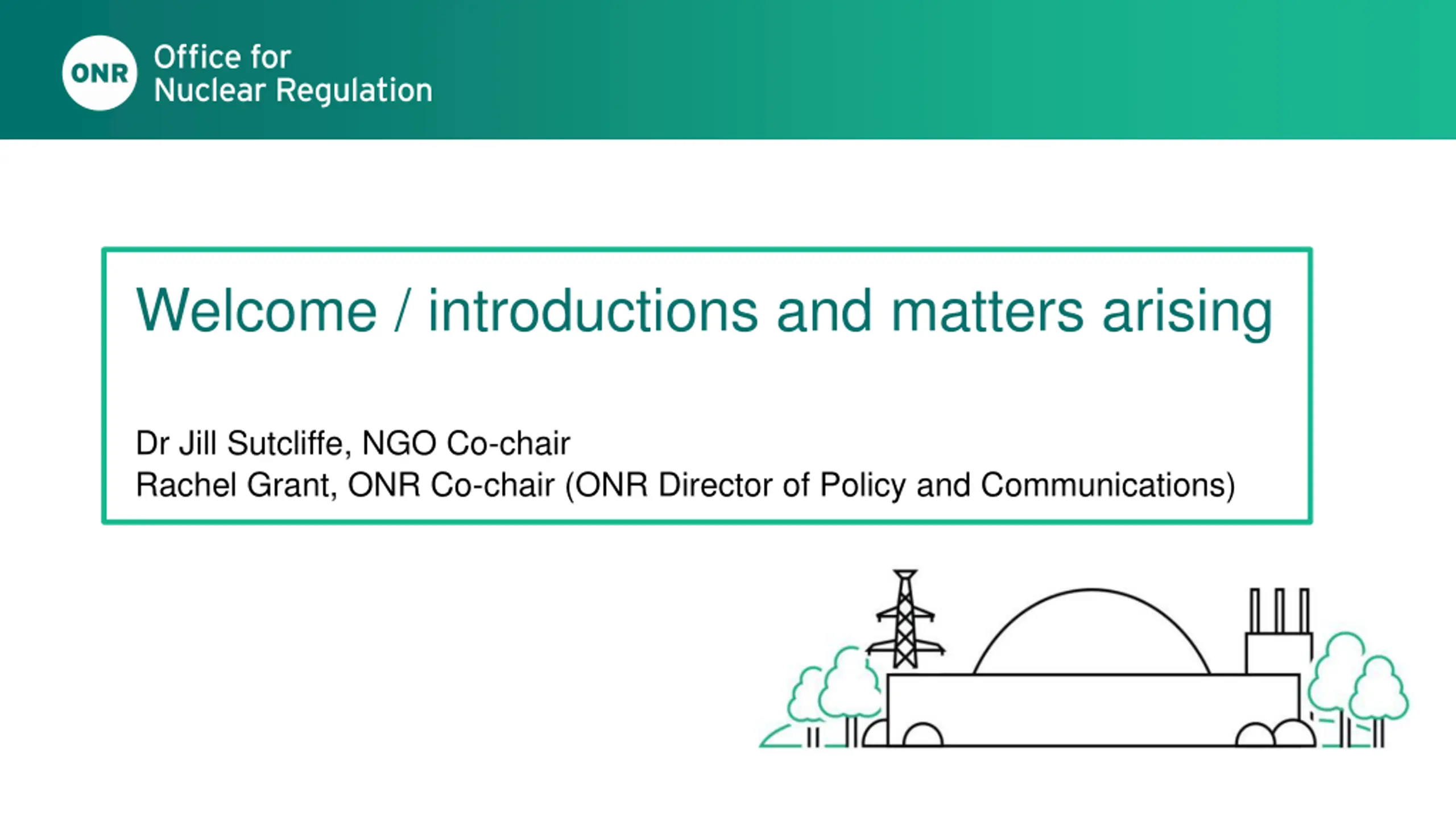 Welcome / introductions and matters arising Dr Jill Sutcliffe, NGO Co-chair Rachel Grant, ONR Co-chair (ONR Director of Policy and Communications)