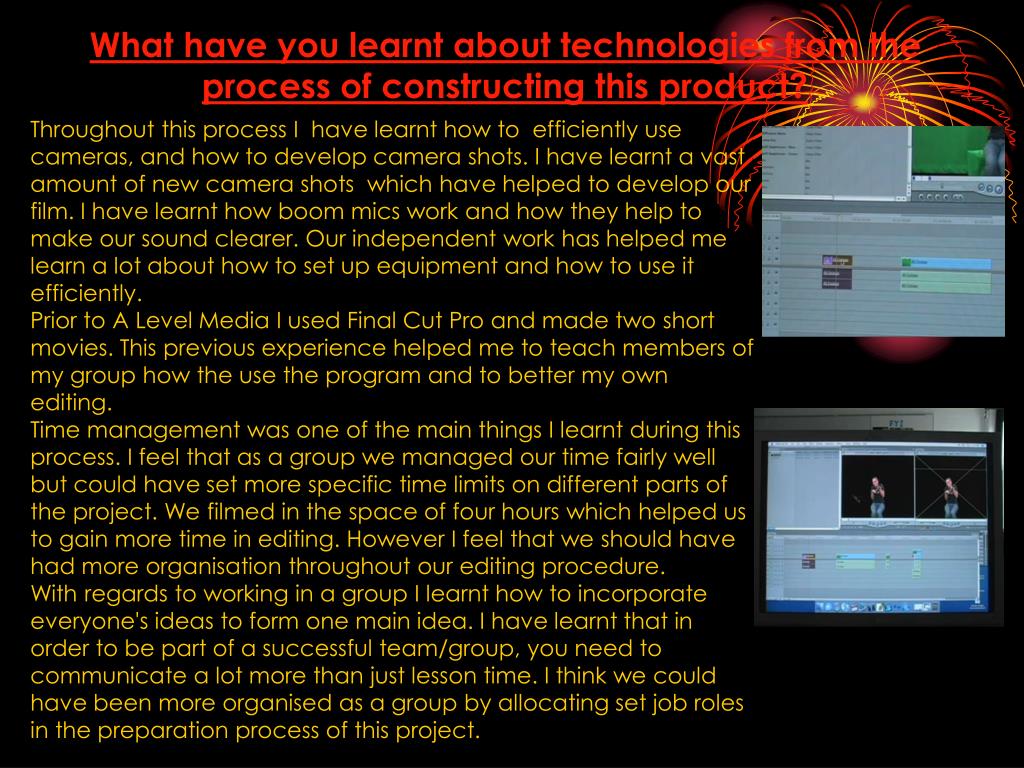 What have you learnt about technologies from the process of constructing this product? Throughout this process I have learnt how to efficiently use cameras, and how to develop camera shots. I have learnt a vast amount of new camera shots which have helped to develop our film. I have learnt how boom mics work and how they help to make our sound clearer. Our independent work has helped me learn a lot about how to set up equipment and how to use it efficiently. Prior to A Level Media I used Final Cut Pro and made two short movies. This previous experience helped me to teach members of my group how the use the program and to better my own editing. Time management was one of the main things I learnt during this process. I feel that as a group we managed our time fairly well but could have set more specific time limits on different parts of the project. We filmed in the space of four hours which helped us to gain more time in editing. However I feel that we should have had more organisation throughout our editing procedure. With regards to working in a group I learnt how to incorporate everyone's ideas to form one main idea. I have learnt that in order to be part of a successful team/group, you need to communicate a lot more than just lesson time. I think we could have been more organised as a group by allocating set job roles in the preparation process of this project.