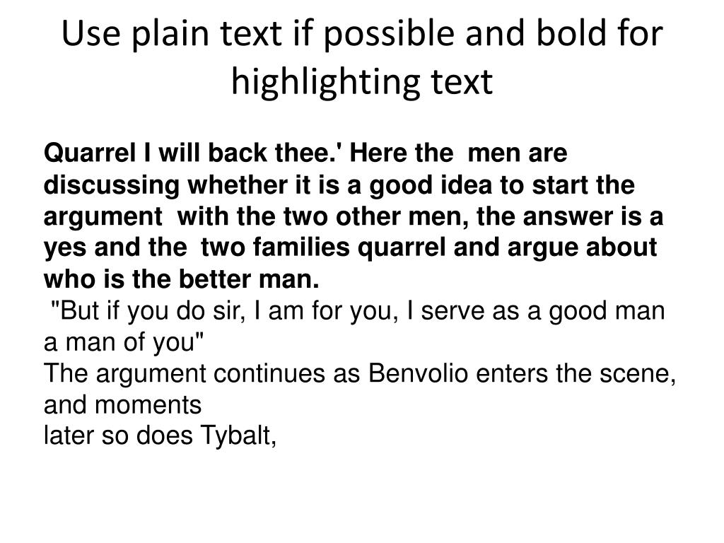 Use plain text if possible and bold for highlighting text Quarrel I will back thee.' Here the men are discussing whether it is a good idea to start the argument with the two other men, the answer is a yes and the two families quarrel and argue about who is the better man. "But if you do sir, I am for you, I serve as a good man a man of you" The argument continues as Benvolio enters the scene, and moments later so does Tybalt,