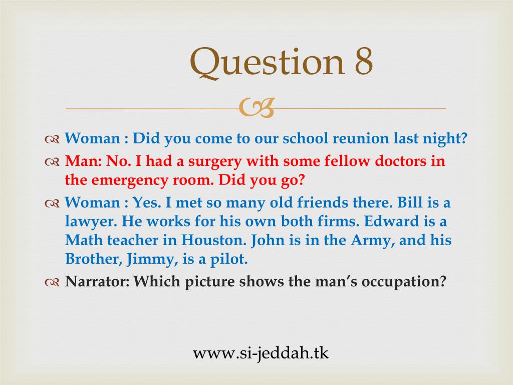 Question 8 • Woman : Did you come to our school reunion last night? • Man: No. I had a surgery with some fellow doctors inthe emergency room. Did you go? • Woman : Yes. I met so many old friends there. Bill is a lawyer. He works for his own both firms. Edward is a Math teacher in Houston. John is in the Army, and his Brother, Jimmy, is a pilot. • Narrator: Which picture shows the man’s occupation? www.si-jeddah.tk