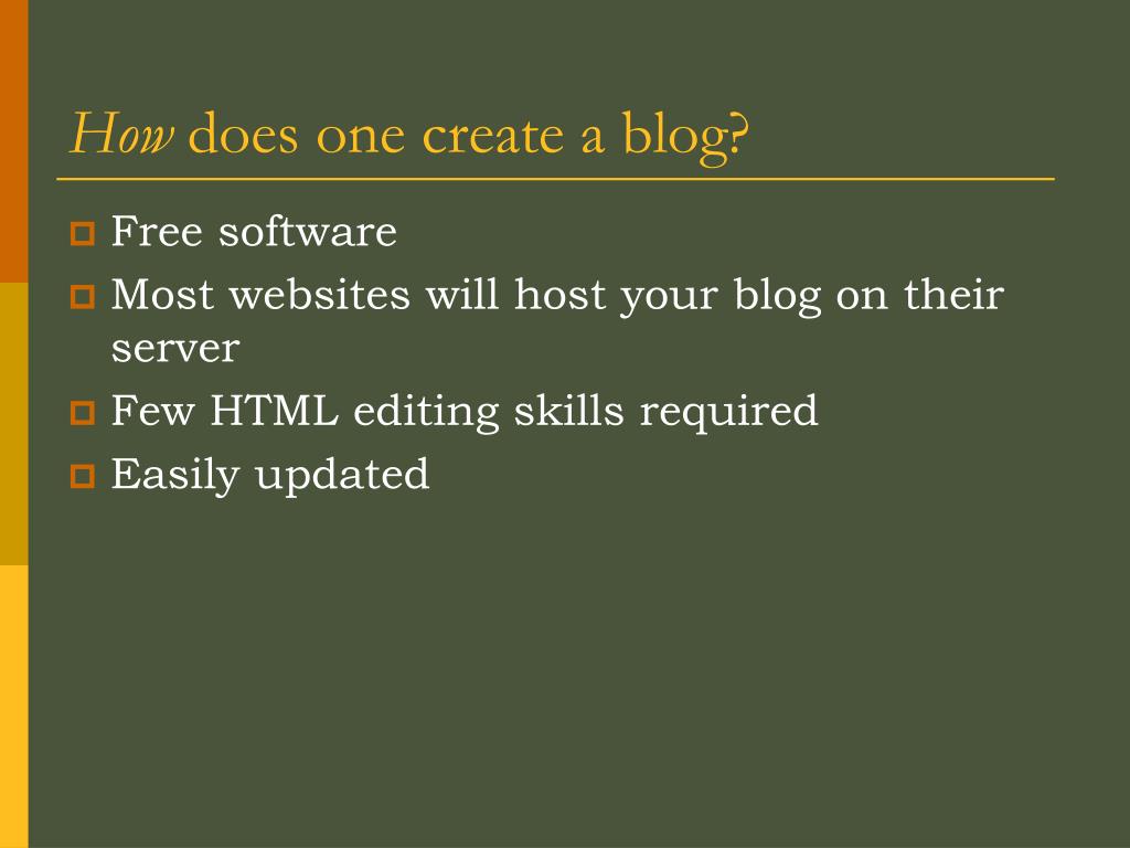 How does one create a blog? • Free software • Most websites will host your blog on their server • Few HTML editing skills required • Easily updated