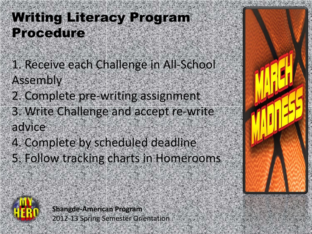 Writing Literacy ProgramProcedure1. Receive each Challenge in All-School Assembly2. Complete pre-writing assignment3. Write Challenge and accept re-write advice4. Complete by scheduled deadline5. Follow tracking charts in Homerooms Shangde-American Program 2012-13 Spring Semester Orientation