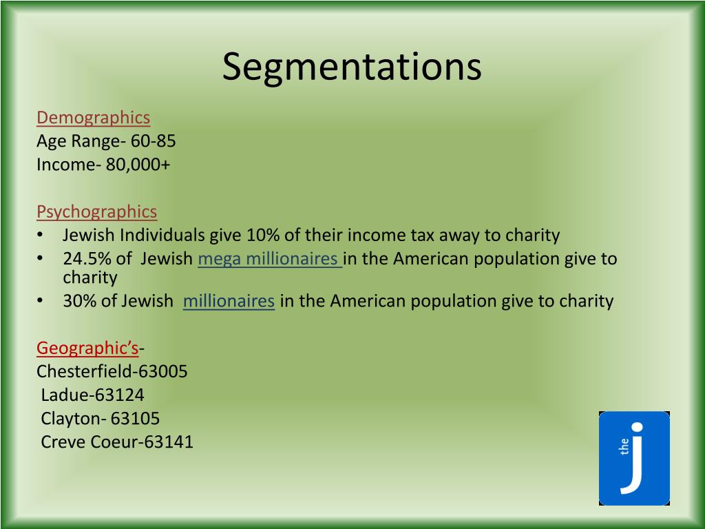 Segmentations Demographics Age Range- 60-85 Income- 80,000+ Psychographics • Jewish Individuals give 10% of their income tax away to charity • 24.5% of Jewish mega millionaires in the American population give to charity • 30% of Jewish millionaires in the American population give to charity Geographic’s- Chesterfield-63005 Ladue-63124 Clayton-63105 Creve Coeur-63141
