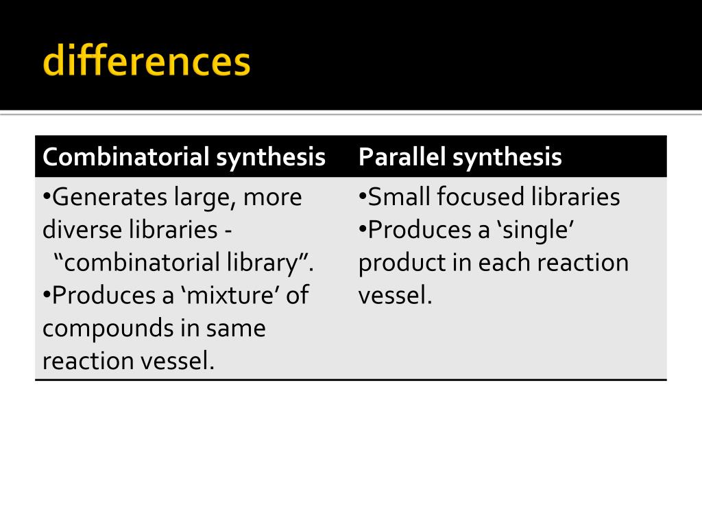 solid-phase chemistry • A technique used in combinatorial chemistry • synthesizes large volume of compounds • reactions take place on the surface of resin beads • each type of reactant molecule is bonded covalently onto a very small resin bead • uses mix and split process