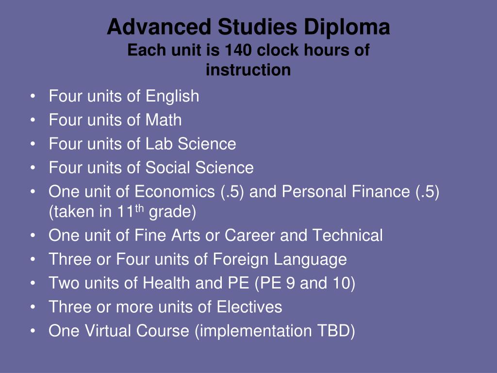 Advanced Studies DiplomaEach unit is 140 clock hours ofinstruction • Four units of English • Four units of Math • Four units of Lab Science • Four units of Social Science • One unit of Economics (.5) and Personal Finance (.5) (taken in 11th grade) • One unit of Fine Arts or Career and Technical • Three or Four units of Foreign Language • Two units of Health and PE (PE 9 and 10) • Three or more units of Electives • One Virtual Course (implementation TBD)