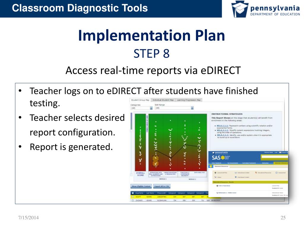 Implementation Plan STEP 1: Contact PA Customer Service for initial system setup STEP 2: Complete the eDIRECT user setup process STEP 3: Complete PA Online Assessment software installation STEP 4: Complete the Test Setup process STEP 5: Administer the Online Tutorials STEP 6: Administer the Online Tools Training STEP 7: Administer the CDT STEP 8: Access real-time reports via eDIRECT STEP 9: Determine instructional plan for student(s)