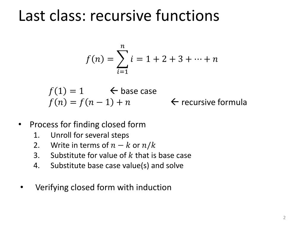 Last class: recursive functions base case recursive formula • Process for finding closed form • Unroll for several steps • Write in terms of or • Substitute for value of that is base case • Substitute base case value(s) and solve • Verifying closed form with induction
