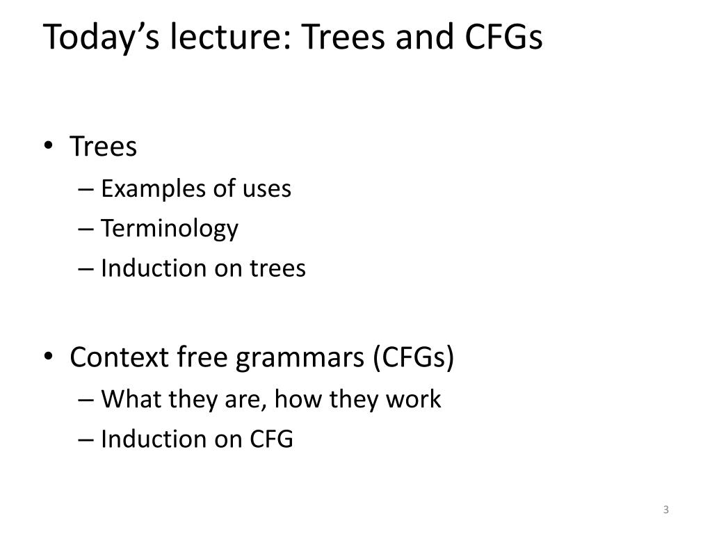 Today’s lecture: Trees and CFGs • Trees • Examples of uses • Terminology • Induction on trees • Context free grammars (CFGs) • What they are, how they work • Induction on CFG
