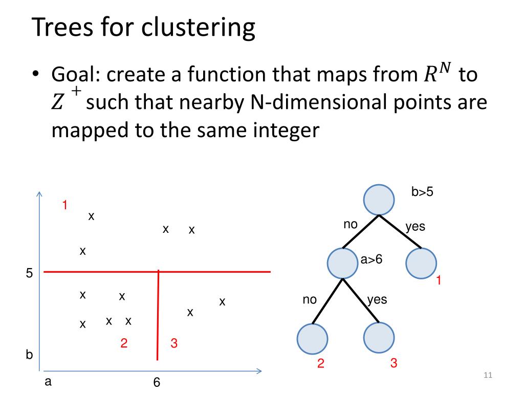 Trees for clustering • Goal: create a function that maps from to such that nearby N-dimensional points are mapped to the same integer b>5 1 x no yes x x x a>6 5 1 x x no yes x x x x x 2 3 b 3 2 a 6