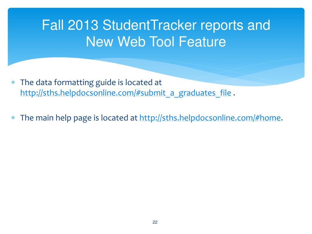 Fall 2013 StudentTracker reports andNew Web Tool Feature The data formatting guide is located at http://sths.helpdocsonline.com/#submit_a_graduates_file . The main help page is located at http://sths.helpdocsonline.com/#home.