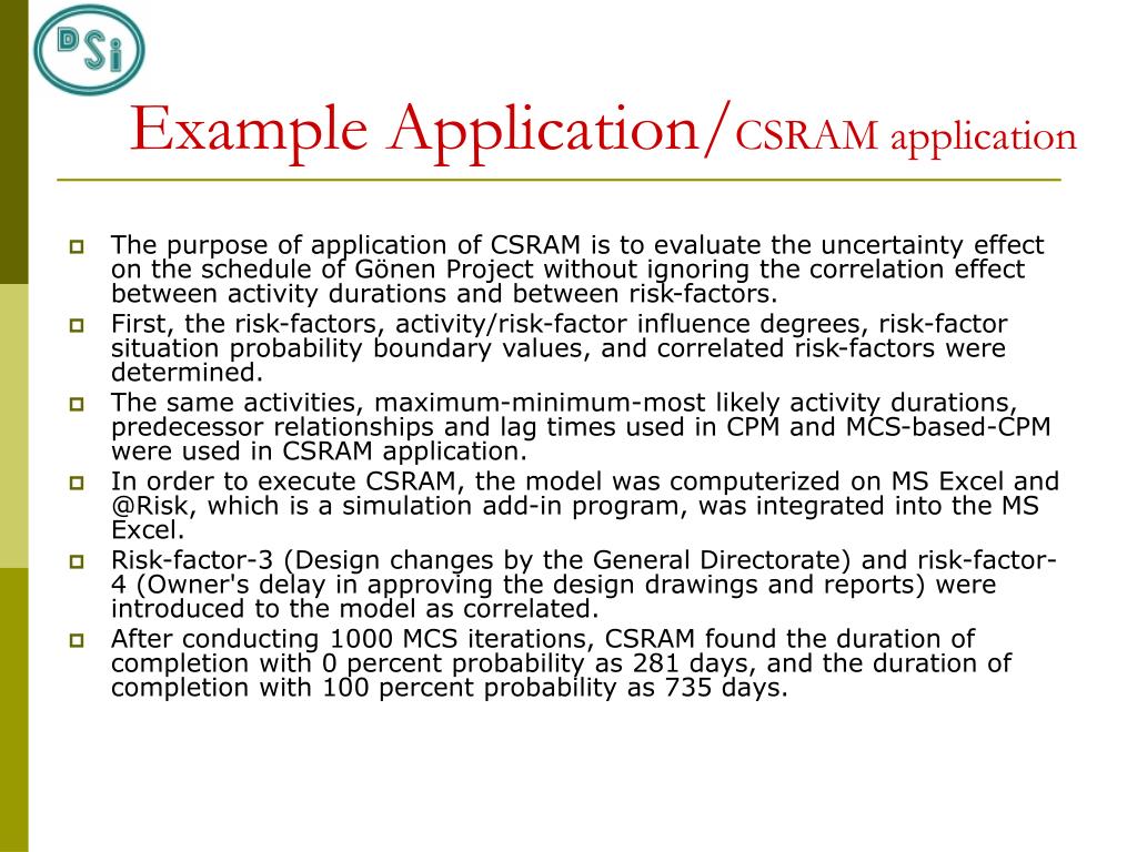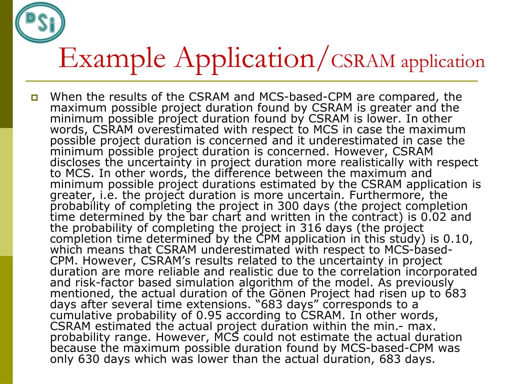 Example Application/CSRAM application • When the results of the CSRAM and MCS-based-CPM are compared, the maximum possible project duration found by CSRAM is greater and the minimum possible project duration found by CSRAM is lower. In other words, CSRAM overestimated with respect to MCS in case the maximum possible project duration is concerned and it underestimated in case the minimum possible project duration is concerned. However, CSRAM discloses the uncertainty in project duration more realistically with respect to MCS. In other words, the difference between the maximum and minimum possible project durations estimated by the CSRAM application is greater, i.e. the project duration is more uncertain. Furthermore, the probability of completing the project in 300 days (the project completion time determined by the bar chart and written in the contract) is 0.02 and the probability of completing the project in 316 days (the project completion time determined by the CPM application in this study) is 0.10, which means that CSRAM underestimated with respect to MCS-based-CPM. However, CSRAM’s results related to the uncertainty in project duration are more reliable and realistic due to the correlation incorporated and risk-factor based simulation algorithm of the model. As previously mentioned, the actual duration of the Gönen Project had risen up to 683 days after several time extensions. “683 days” corresponds to a cumulative probability of 0.95 according to CSRAM. In other words, CSRAM estimated the actual project duration within the min.-max. probability range. However, MCS could not estimate the actual duration because the maximum possible duration found by MCS-based-CPM was only 630 days which was lower than the actual duration, 683 days.