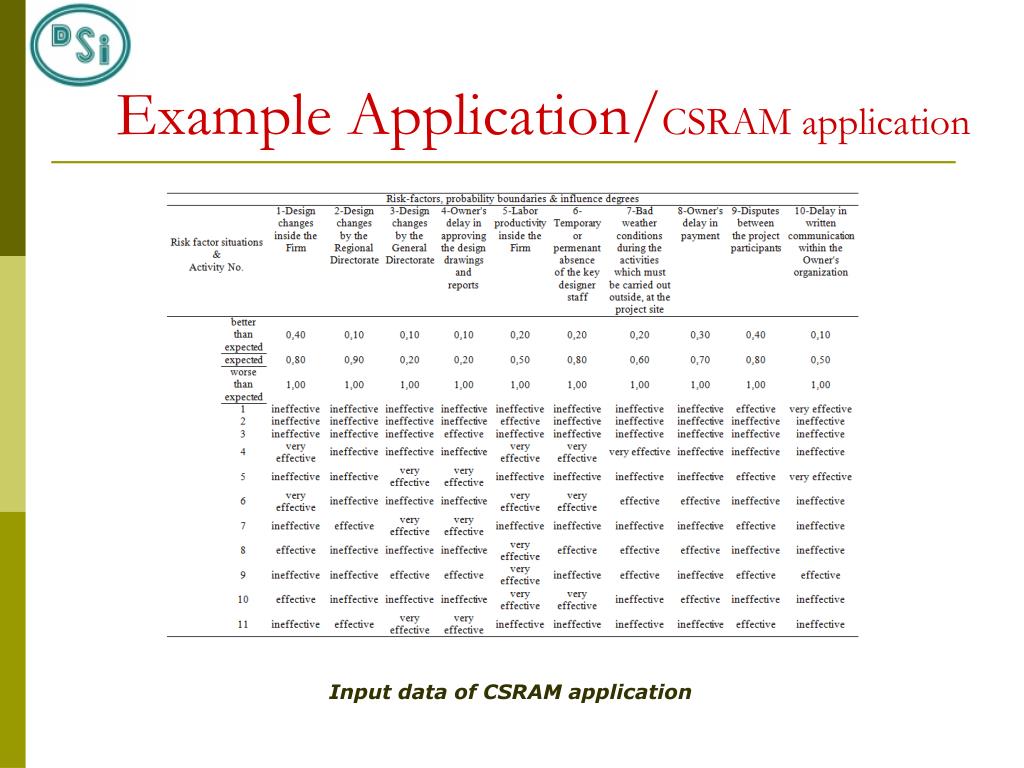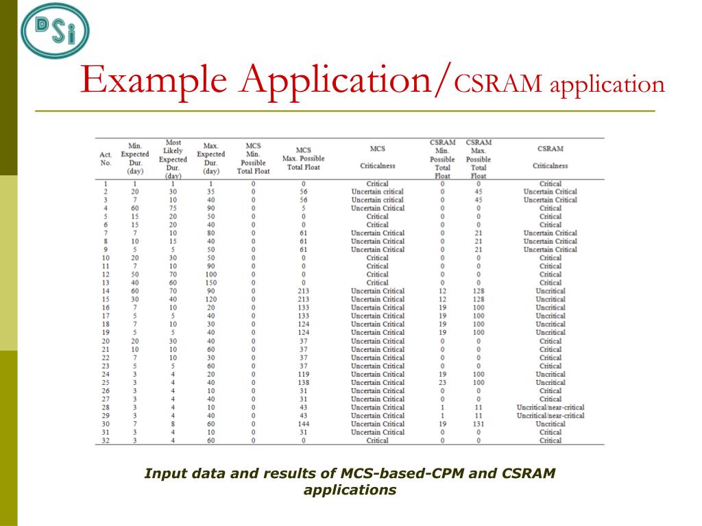 Example Application/CSRAM application Input data and results of MCS-based-CPM and CSRAM applications