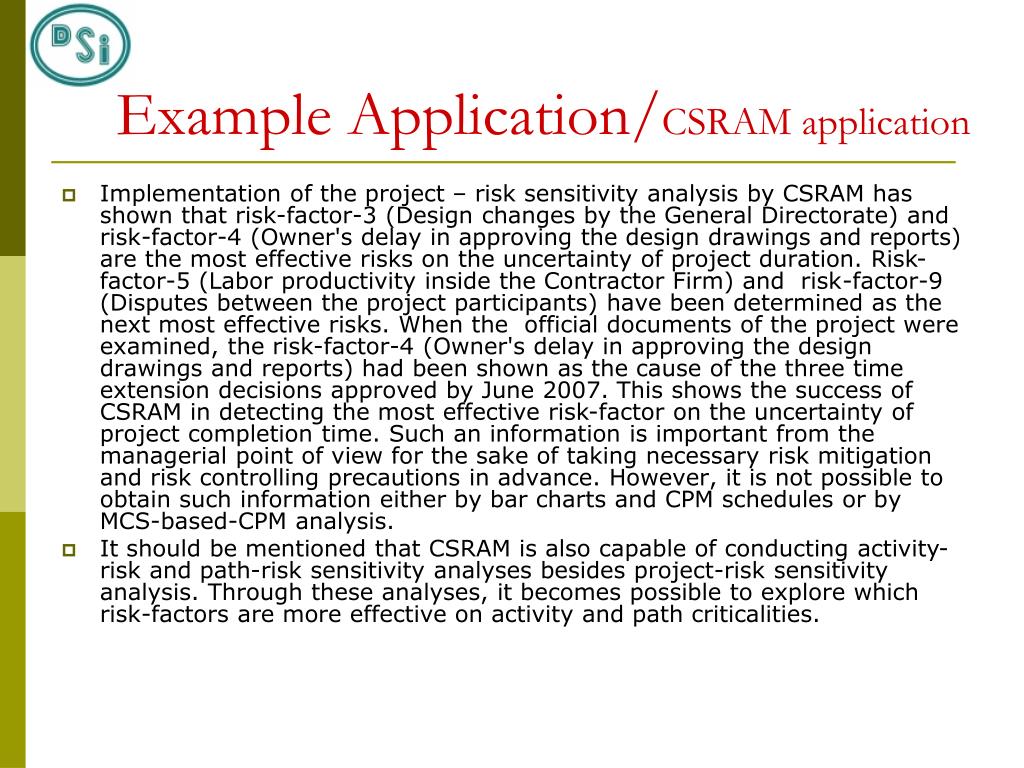 Example Application/CSRAM application • Implementation of the project – risk sensitivity analysis by CSRAM has shown that risk-factor-3 (Design changes by the General Directorate) and risk-factor-4 (Owner's delay in approving the design drawings and reports) are the most effective risks on the uncertainty of project duration. Risk-factor-5 (Labor productivity inside the Contractor Firm) and risk-factor-9 (Disputes between the project participants) have been determined as the next most effective risks. When the official documents of the project were examined, the risk-factor-4 (Owner's delay in approving the design drawings and reports) had been shown as the cause of the three time extension decisions approved by June 2007. This shows the success of CSRAM in detecting the most effective risk-factor on the uncertainty of project completion time. Such an information is important from the managerial point of view for the sake of taking necessary risk mitigation and risk controlling precautions in advance. However, it is not possible to obtain such information either by bar charts and CPM schedules or by MCS-based-CPM analysis. • It should be mentioned that CSRAM is also capable of conducting activity-risk and path-risk sensitivity analyses besides project-risk sensitivity analysis. Through these analyses, it becomes possible to explore which risk-factors are more effective on activity and path criticalities.