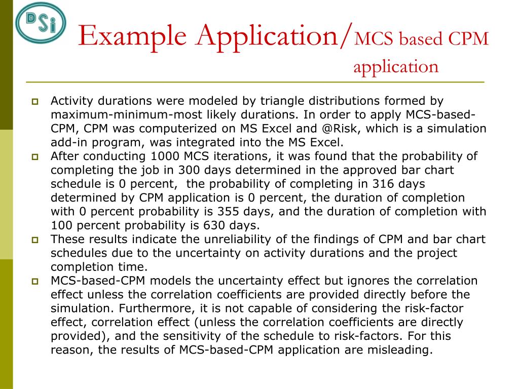 Example Application/MCS based CPM application • Activity durations were modeled by triangle distributions formed by maximum-minimum-most likely durations. In order to apply MCS-based-CPM, CPM was computerized on MS Excel and @Risk, which is a simulation add-in program, was integrated into the MS Excel. • After conducting 1000 MCS iterations, it was found that the probability of completing the job in 300 days determined in the approved bar chart schedule is 0 percent, the probability of completing in 316 days determined by CPM application is 0 percent, the duration of completion with 0 percent probability is 355 days, and the duration of completion with 100 percent probability is 630 days. • These results indicate the unreliability of the findings of CPM and bar chart schedules due to the uncertainty on activity durations and the project completion time. • MCS-based-CPM models the uncertainty effect but ignores the correlation effect unless the correlation coefficients are provided directly before the simulation. Furthermore, it is not capable of considering the risk-factor effect, correlation effect (unless the correlation coefficients are directly provided), and the sensitivity of the schedule to risk-factors. For this reason, the results of MCS-based-CPM application are misleading.