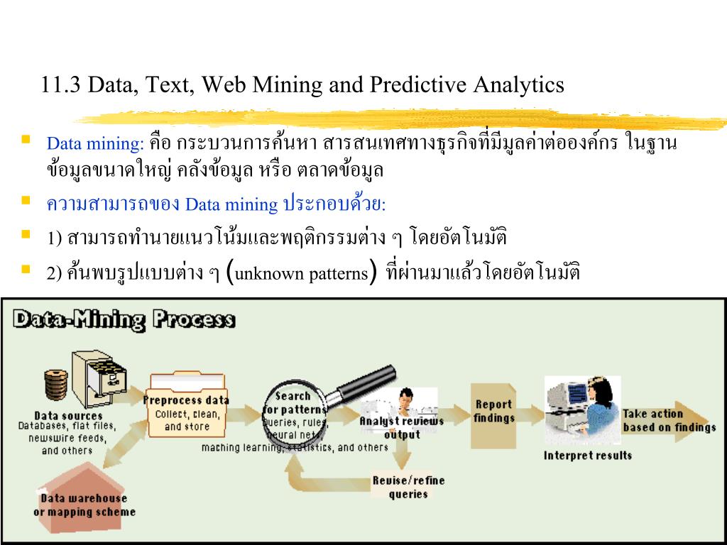 11.3 Data, Text, Web Mining and Predictive Analytics • Data mining:คือ กระบวนการค้นหา สารสนเทศทางธุรกิจที่มีมูลค่าต่อองค์กรในฐาน ข้อมูลขนาดใหญ่คลังข้อมูลหรือตลาดข้อมูล • ความสามารถของ Data mining ประกอบด้วย: • 1) สามารถทำนายแนวโน้มและพฤติกรรมต่าง ๆ โดยอัตโนมัติ • 2) ค้นพบรูปแบบต่าง ๆ (unknown patterns) ที่ผ่านมาแล้วโดยอัตโนมัติ