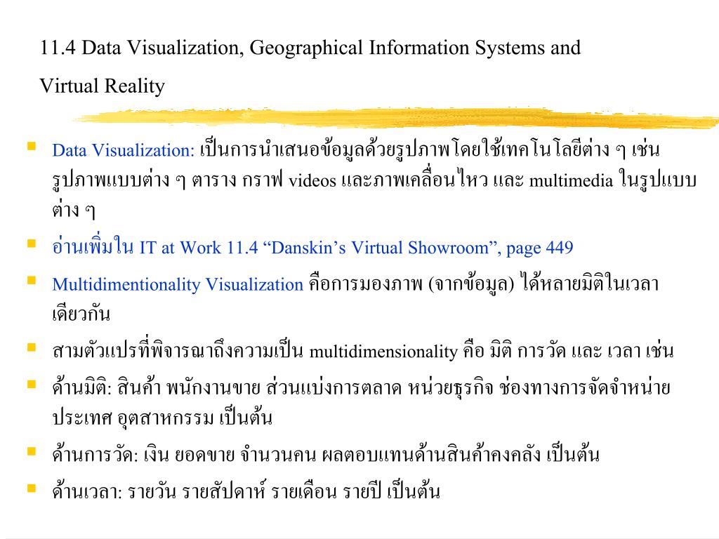 11.4 Data Visualization, Geographical Information Systems and Virtual Reality • Data Visualization:เป็นการนำเสนอข้อมูลด้วยรูปภาพโดยใช้เทคโนโลยีต่าง ๆ เช่น รูปภาพแบบต่าง ๆ ตาราง กราฟ videos และภาพเคลื่อนไหวและ multimedia ในรูปแบบต่าง ๆ • อ่านเพิ่มใน IT at Work 11.4 “Danskin’s Virtual Showroom”, page 449 • Multidimentionality Visualization คือการมองภาพ (จากข้อมูล) ได้หลายมิติในเวลาเดียวกัน • สามตัวแปรที่พิจารณาถึงความเป็น multidimensionality คือ มิติ การวัด และ เวลา เช่น • ด้านมิติ: สินค้า พนักงานขาย ส่วนแบ่งการตลาด หน่วยธุรกิจ ช่องทางการจัดจำหน่าย ประเทศ อุตสาหกรรม เป็นต้น • ด้านการวัด: เงิน ยอดขาย จำนวนคน ผลตอบแทนด้านสินค้าคงคลัง เป็นต้น • ด้านเวลา: รายวัน รายสัปดาห์ รายเดือน รายปี เป็นต้น