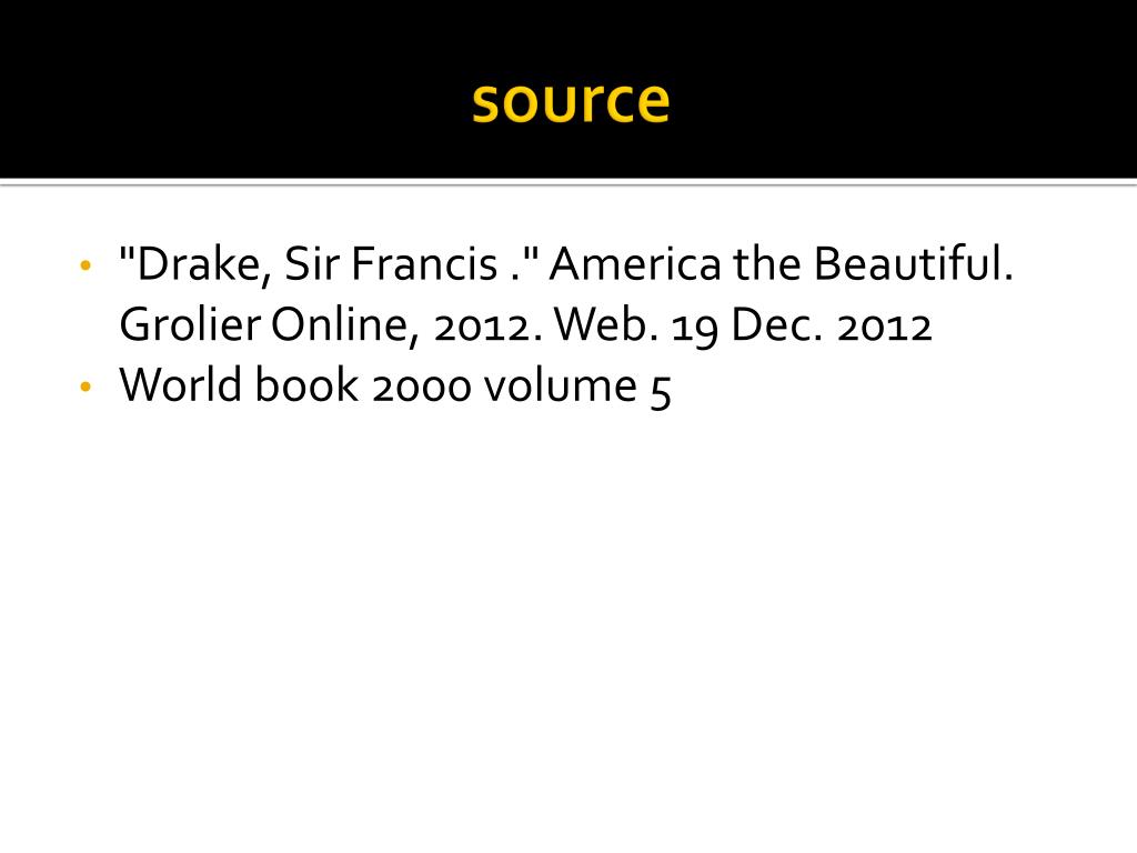source • "Drake, Sir Francis ." America the Beautiful. Grolier Online, 2012. Web. 19 Dec. 2012 • World book 2000 volume 5